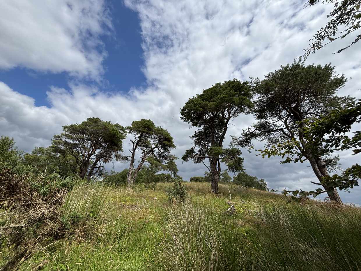 Some old Scots pines near the summit of Knockmountain. Birds of prey overhead. (2025)